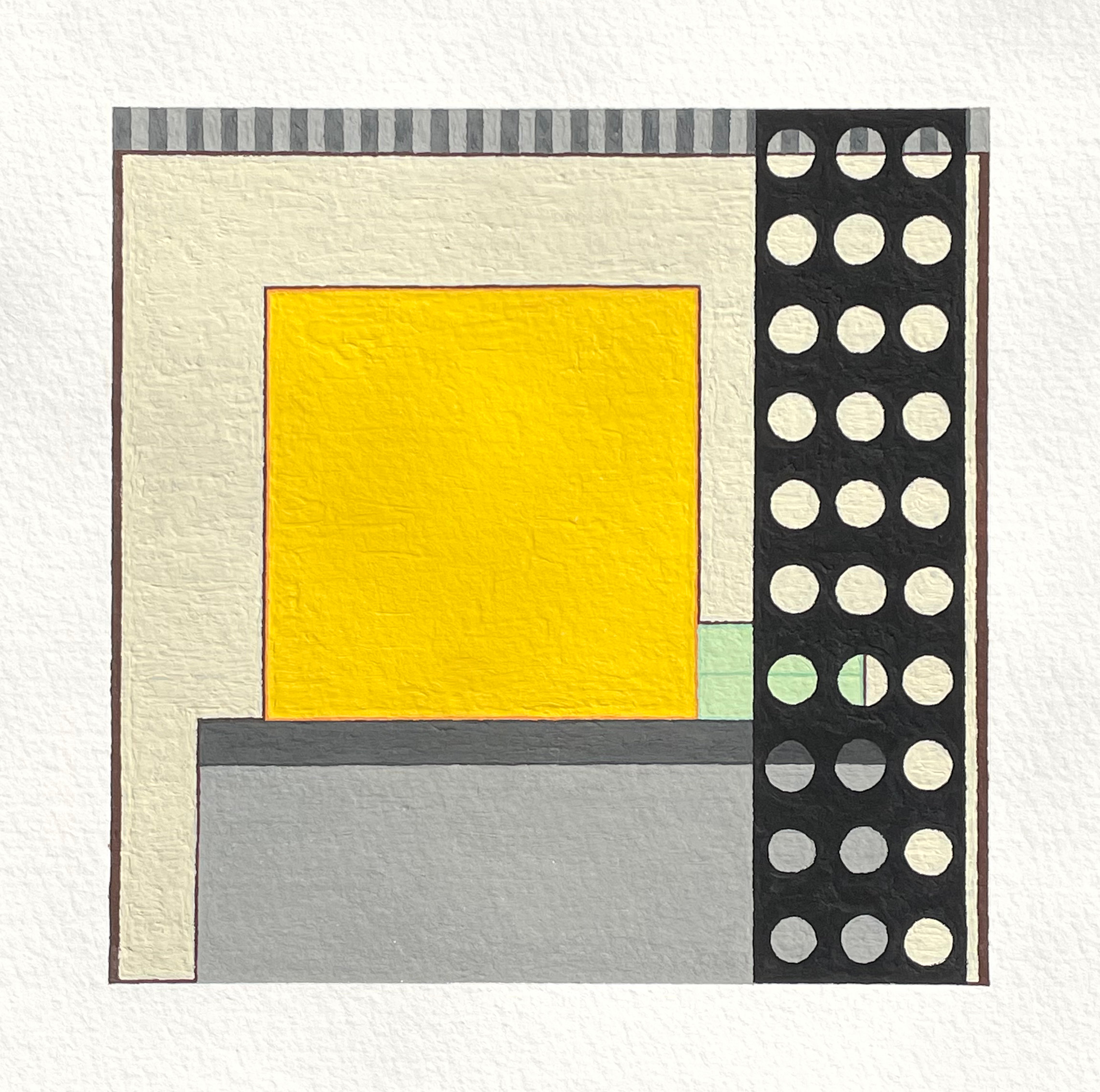 Abstract geometric painting with blocks of cream, yellow, pink, brown, black, and blue shapes.